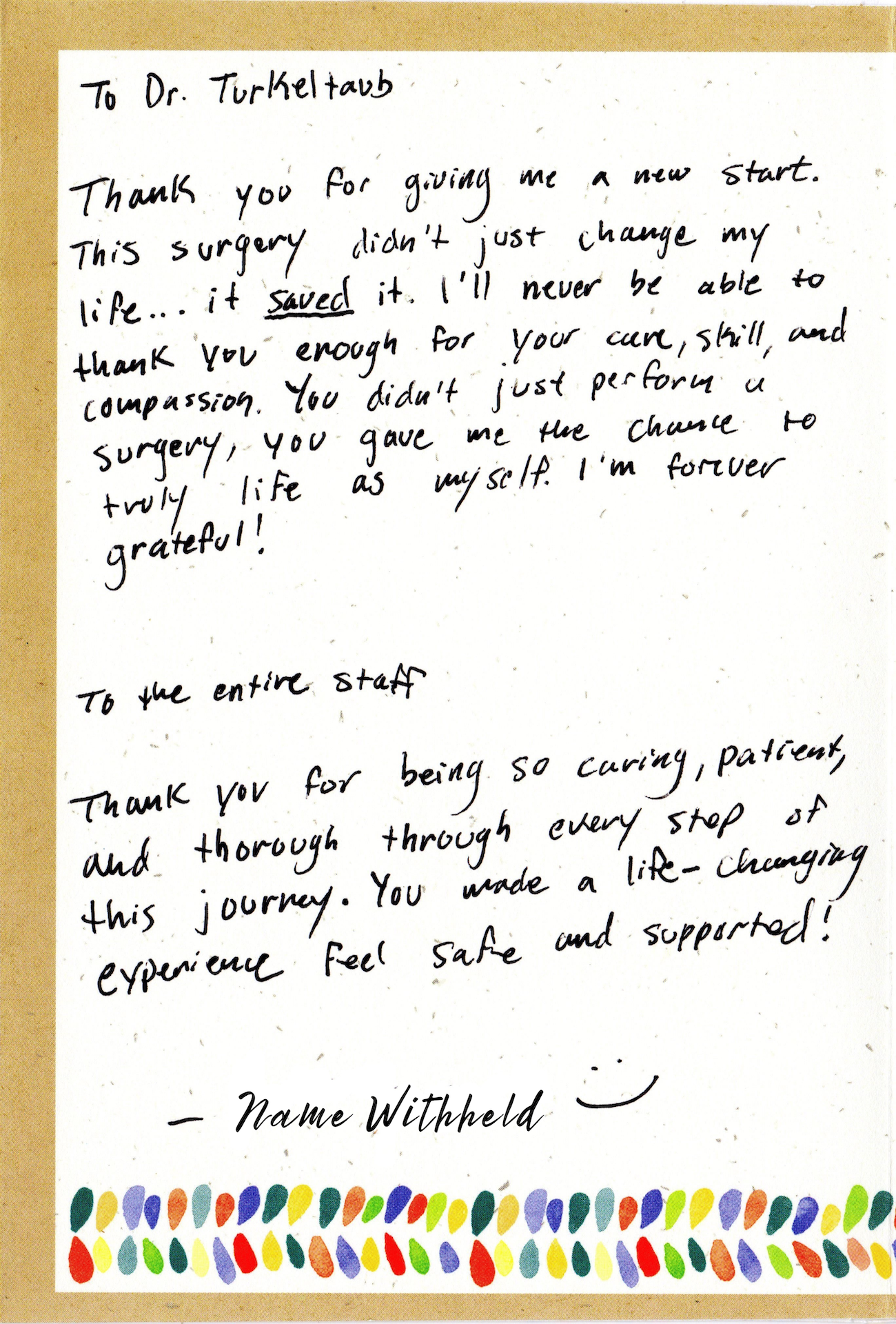 The letter below comes from one of our top surgery patients who wanted to share their heartfelt thanks and describe how their experience with us has made a lasting difference in their life. We are grateful to have played a role in their transformation and honored to share their story.